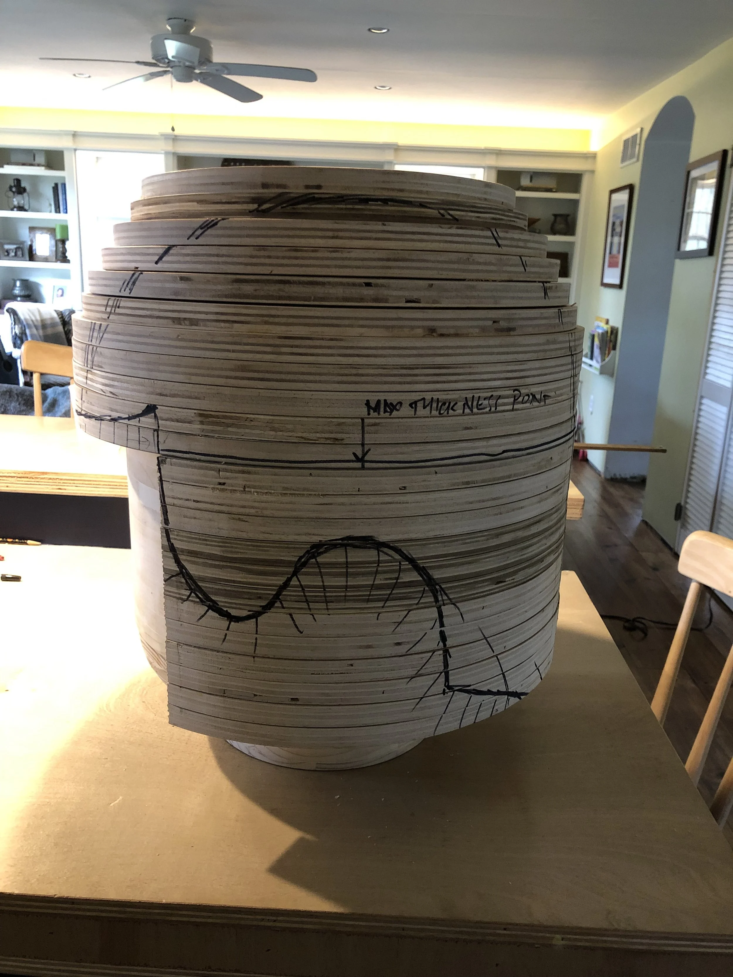From these pictures it looks like I used 9 layers of 3/4” thick primed pine for each hand, then I cut the openings on the table saw or bandsaw. After that I rough cut the bottom curvature using a bandsaw, then a lot of sanding to smooth everything inside and out, again using my oscillating spindle sander and upright belt sander.