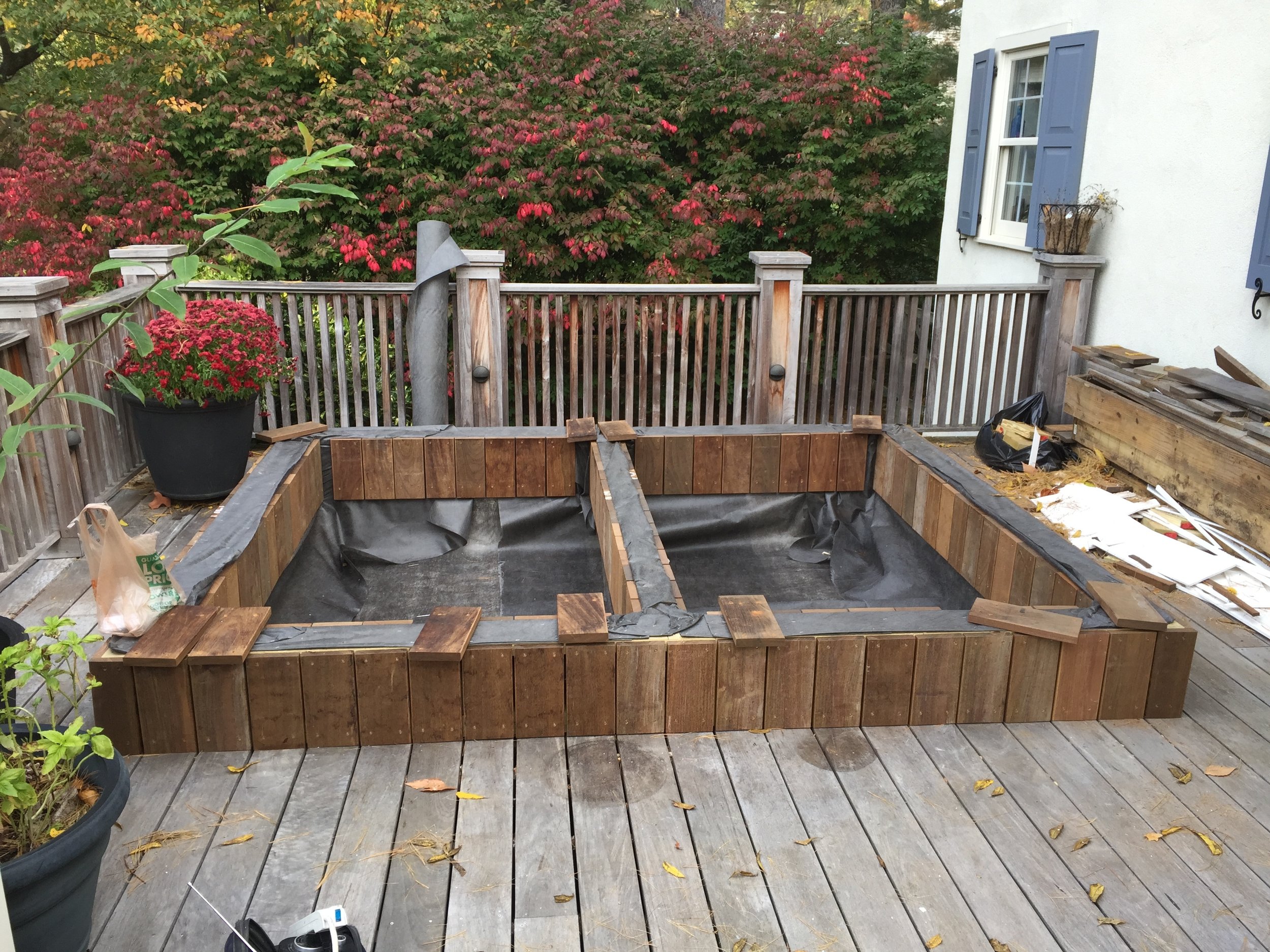 After lining the interior with filter fabric, I applied ipe deck boards to the exterior and interior walls so that they would line up exactly with the existing decking. Over time, they will weather to the same silver color as the rest of the decking.