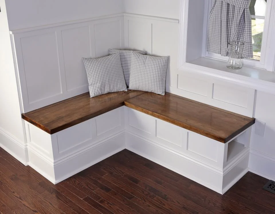 This banquette is part of a larger project that included a kitchen table; pictures of the entire project can be seen here. The banquette has solid rock maple tops to match the table I made, and a simple flat panel design on the base and back to match existing paneling in the house.